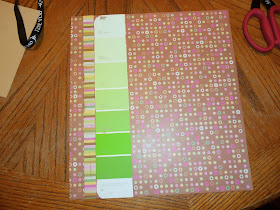 | First, you'll decide which piece of pattern paper you want for the background. Then cut a 3/4" piece of the coordinating pattern paper and adhere it about an inch from the left side. Then adhere your paint chip. (I cut the right edge off of mine to get rid of the little ring hole that was on the corner.) |